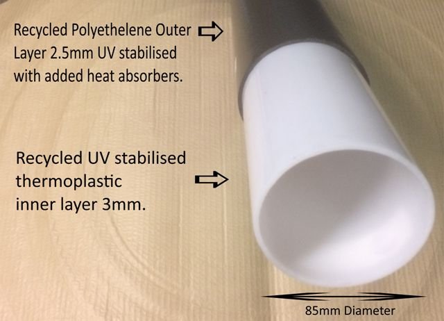 The outer layer is a 100% recycled polyethylene. We add the best UV stabilisers and heat absorbers available to this layer. Therefore our poles are durable in any climate. All our poles are also jet black (not grey or even dark grey) to satisfy environmental requirements.